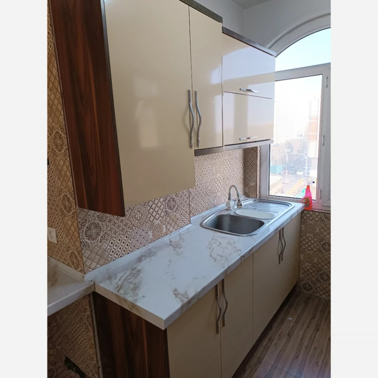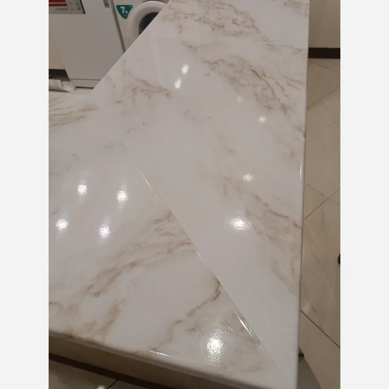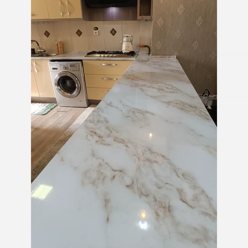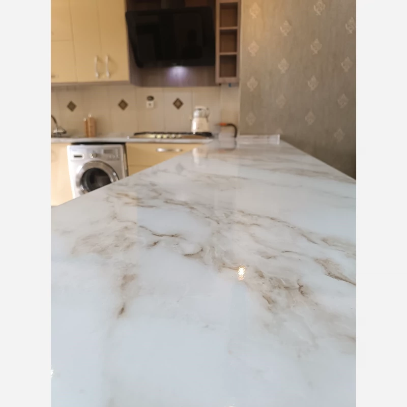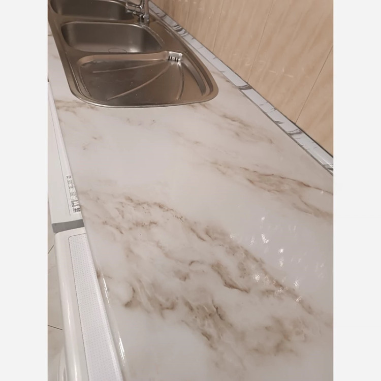 برچسب کابینت طرح سنگ هایگلاس کد 3560 سفید رگه قهوه ای طلایی عرض 90 سانت
